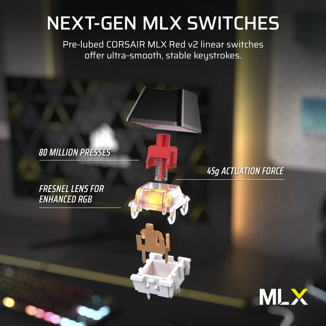| Switch | CORSAIR MLX Red v2 (Linear, lực nhấn 45g, được lube sẵn từ nhà máy cho cảm giác gõ mượt và êm) |