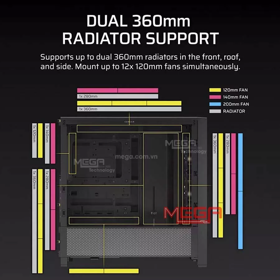 | Fan | Phía trên: 3x 120mm, 2x 140mm Phía trước: 3x 120mm, 2x 140mm, 2x 200mm Bên cạnh: 3x 120mm; 2x 140mm |