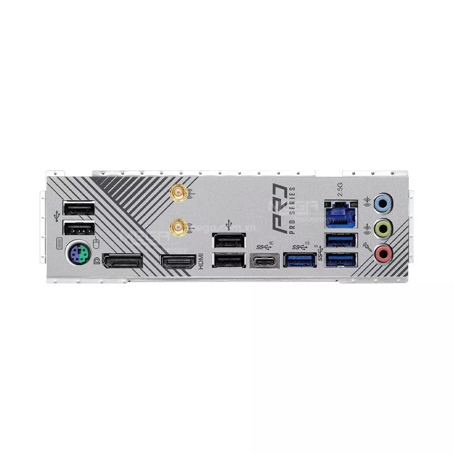 | Cổng I/O phía sau | - 2 x Antenna Ports - 1 x PS/2 Mouse/Keyboard Port - 1 x HDMI Port - 1 x DisplayPort 1.4 - 1 x USB 3.2 Gen2 Type-A Port (10 Gb/s) - 1 x USB 3.2 Gen2 Type-C Port (10 Gb/s) - 2 x USB 3.2 Gen1 Ports - 4 x USB 2.0 Ports - 1 x RJ-45 LAN Port - HD Audio Jacks: Line in / Front Speaker / Microphone |