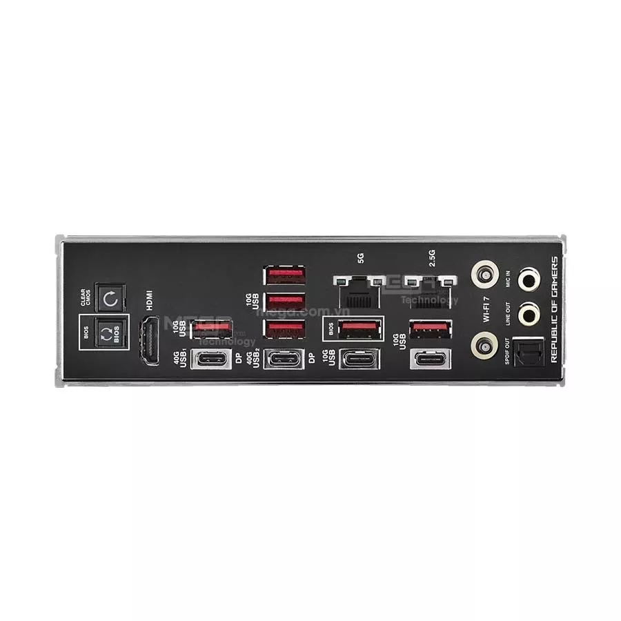 | Cổng I/O phía sau | 2 x Cổng USB4® (40Gbps) (2 x USB Type-C®) 8 x Cổng USB 10Gbps (6 x Type-A + 2 x USB Type-C®) 1 x Cổng HDMI™ 1 x Mô-đun Wi-Fi 1 x Cổng Ethernet Intel® 2.5Gb 1 x Cổng Ethernet Realtek 5Gb 2 x Giắc cắm âm thanh mạ vàng 1 x Cổng ra S/PDIF quang 1 x Nút BIOS FlashBack™ 1 x Nút Clear CMOS |