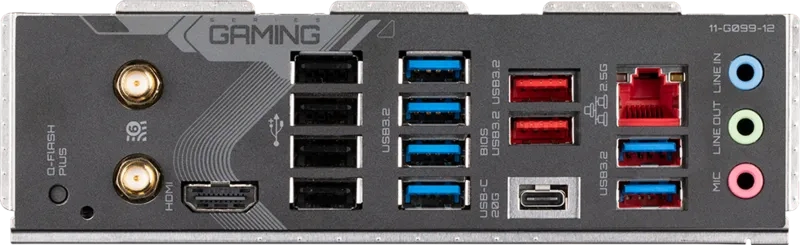 | Cổng I/O phía sau | 1 x USB 3.2 Gen 2x2 (Type-C, 20Gbps) 1 x USB 3.2 Gen 2 (Type-A, màu đỏ) 4 x USB 3.2 Gen 1 (Type-A, màu xanh) 6 x USB 2.0 (Type-A, màu đen) - Rất nhiều cổng USB cho thiết bị ngoại vi 1 x Module Wi-Fi 6E AMD RZ616 (MT7922A22M) + Bluetooth 5.2 1 x Cổng mạng LAN 2.5Gb 3 x Jack âm thanh Nút Q-Flash Plus (Update BIOS nhanh) |
